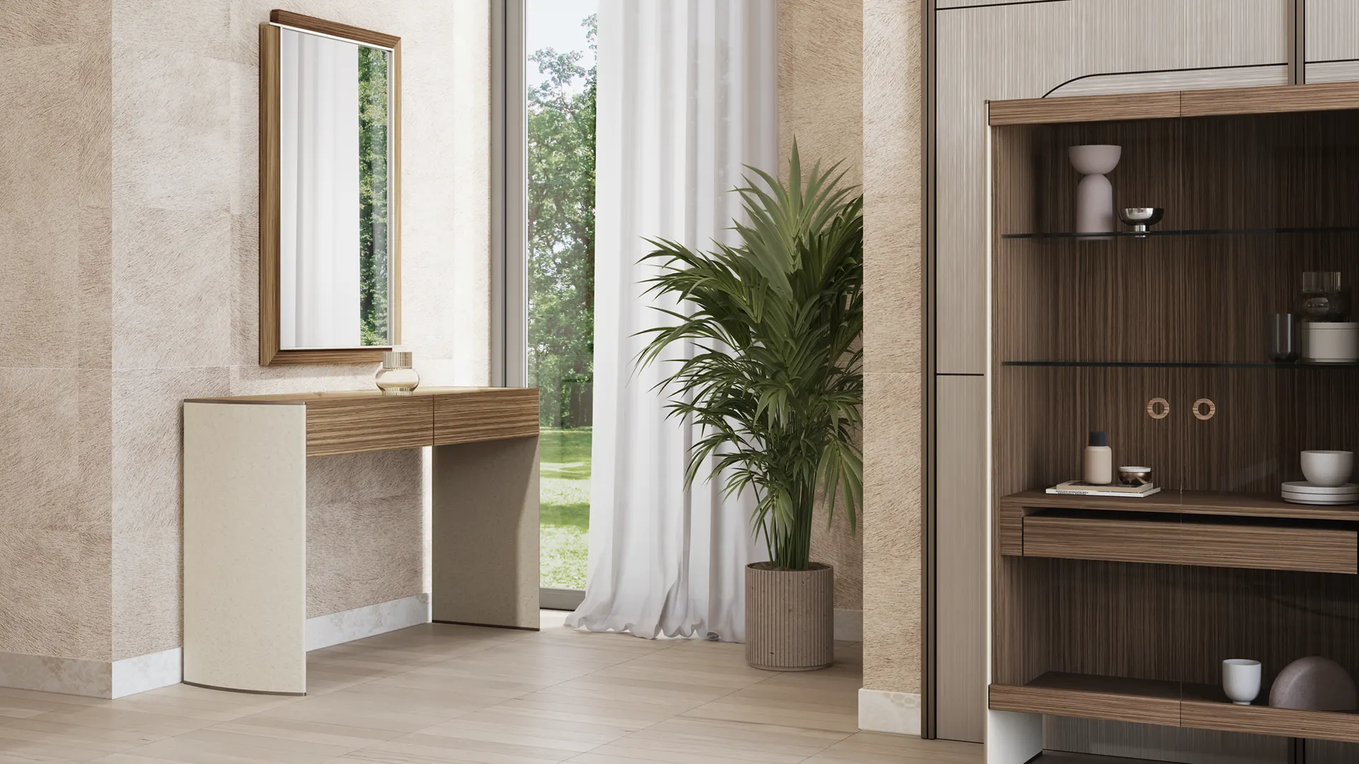 La collezione utilizza legno di noce naturale e legno precomposto, conferendo una sensazione di autenticità e resistenza. I piani intarsiati richiamano tecniche tradizionali, reinterpretate in chiave contemporanea. I dettagli in metalli pregiati, come ottone brunito, si fondono armoniosamente con pelle e tessuti di alta qualità. Le laccature antigraffio garantiscono una superficie durevole e resistente all’usura quotidiana.