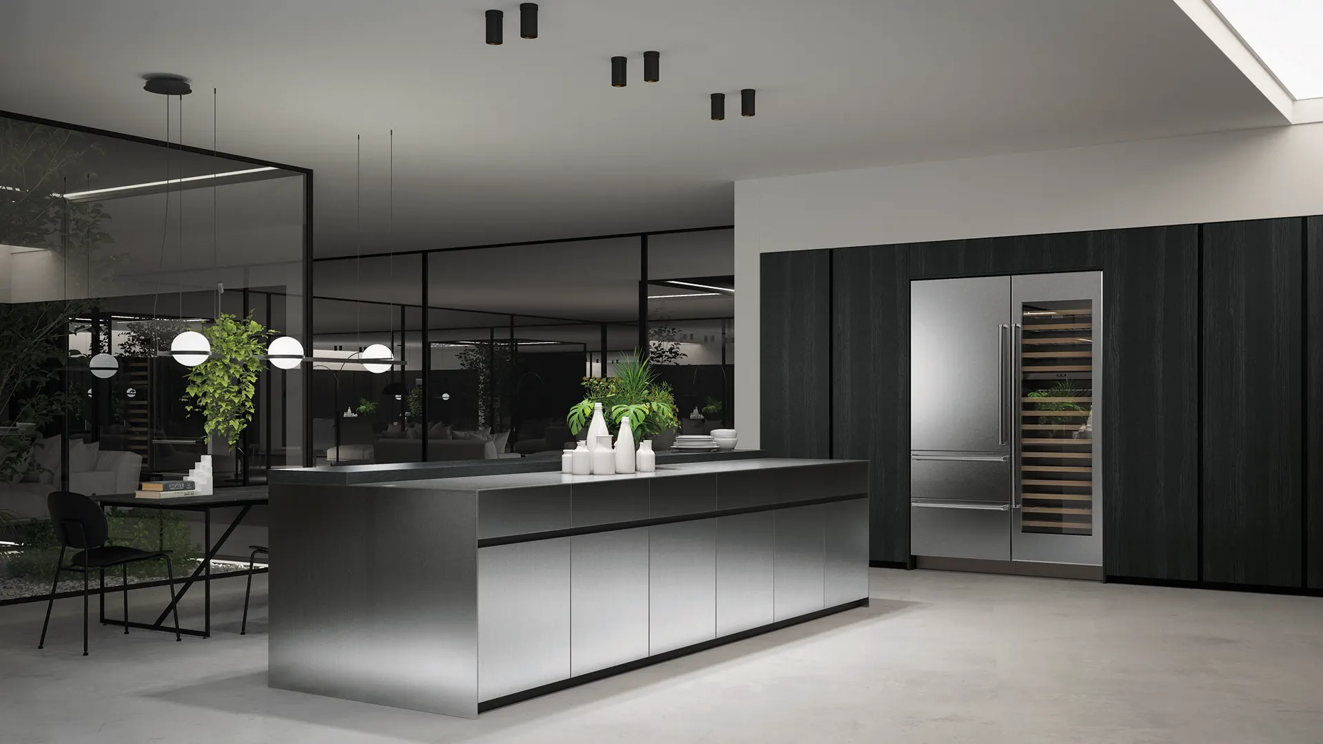 Il cuore della cucina è costituito da un’isola centrale in acciaio inox, elemento distintivo che rappresenta il fulcro visivo e funzionale dell’ambiente. L’acciaio inox, scelto per la sua resistenza e la sua capacità di conferire un aspetto contemporaneo e pulito, contrasta splendidamente con le ante in finitura noce, che aggiungono calore e raffinatezza allo spazio. Le ante in noce sono state lavorate con cura per esaltare le venature naturali del legno, creando un effetto visivo che aggiunge profondità e texture alla cucina. Questo contrasto tra il legno caldo e l’acciaio freddo è stato concepito per riflettere l’equilibrio tra tradizione e modernità che caratterizza l’intera villa.
