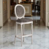 Sgabello bar in stile Luigi XVI con struttura in legno di faggio. È imbottito con gomma poliuretanica a densità differenziata di qualità superiore. Il rivestimento, disponibile in tessuto o in vera pelle, ne esalta la lussuosità e sottolinea il design intramontabile.