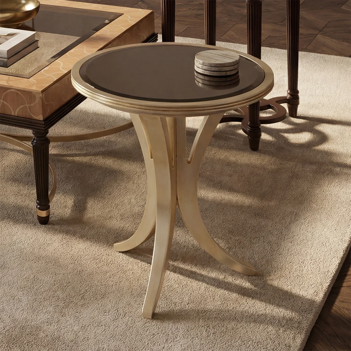 The Flora collection is created and built in dark brown Oak, or in light-toned Kotò wood, and for the living room and office in Anigrè, again with beautiful details in Champagne silver leaf finish.
