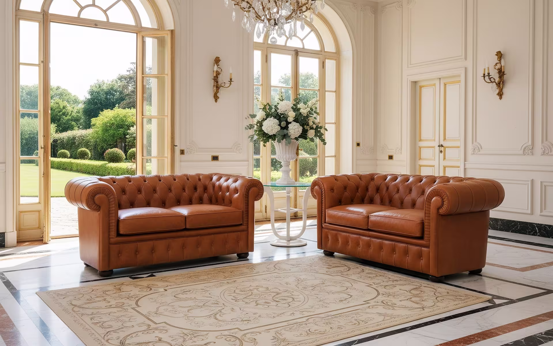 For Chesterfield sofas, we use natural leathers of bovine origin, tanned in Italy and finished to combine softness and durability.