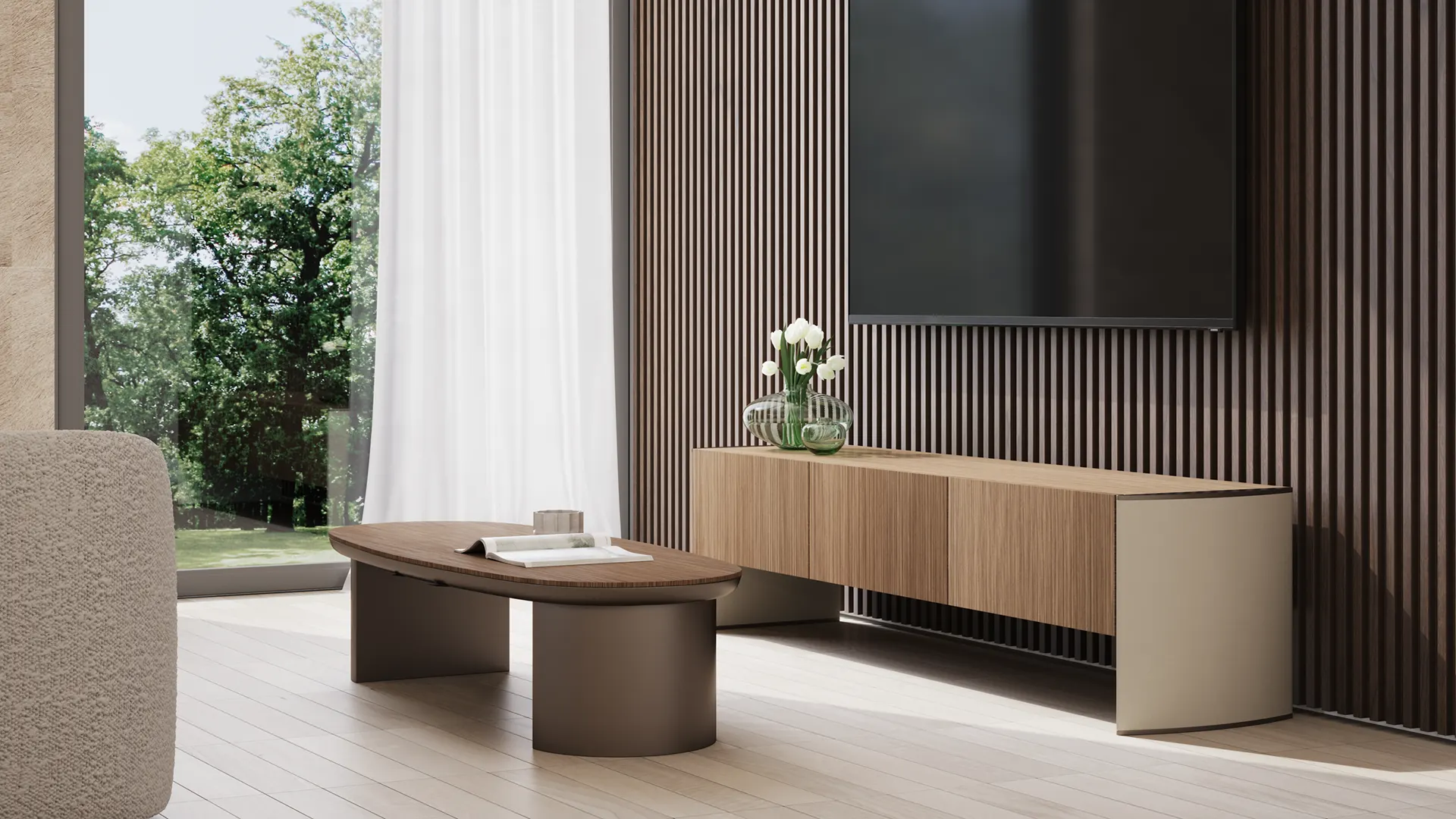 С несколькими новыми элементами, созданными для оформления от спальни до столовой, коллекция AXTRA подчёркивает выразительную текстуру шпона ореха каналетто с деревянными рамками в золотом цвете, оттенок которых придаёт мебели уникальную глубину.